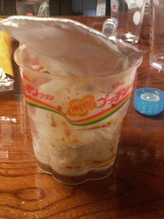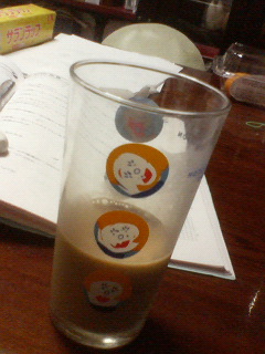 ハッチポッチステーションのコップに牛乳で割ったコーヒーと勉強道具